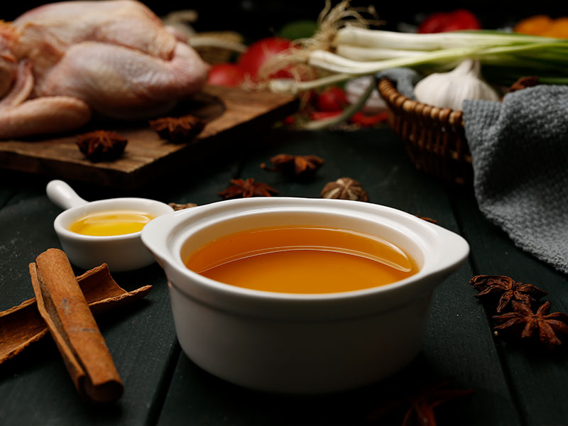 選用精煉雞油添加十余種香辛料熬制而成。產(chǎn)品色澤淺黃透明,蔥香濃郁,在烹調(diào)中起著增香亮色的作用